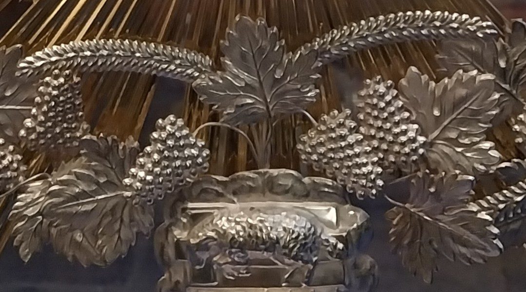 Bien plus récent dans les collections du Trésor, un petit ciboire en argent de 1950, œuvre réalisée à Tournai, présente des épis de blé stylisés sur le pied.