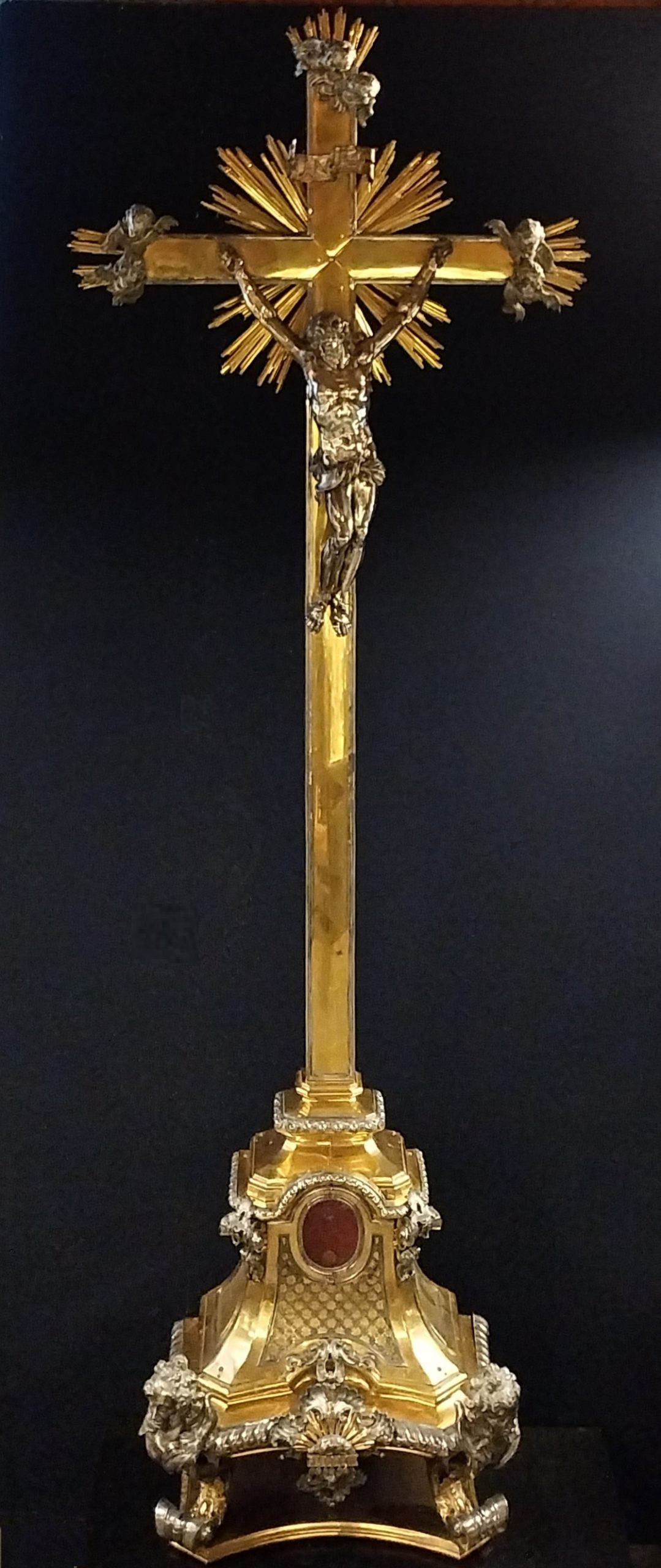- Une croix d’autel monumentale de 1742 (c’est la croix, conservée au Trésor, qui est placée sur le maître-autel pour les grandes cérémonies : Pâques, les Te Deum et les cérémonies de la Ducasse) ;