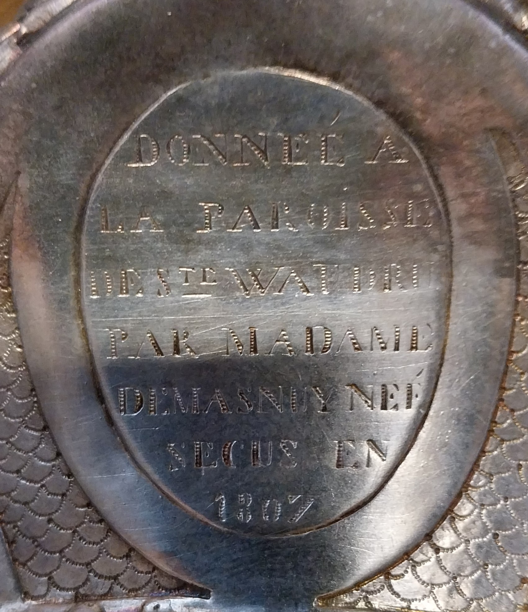 - Un ostensoir-soleil du 2e quart du XVIIIe (cet ostensoir a été, selon inscription gravée, donné « A LA PAROISSE DE STE WAUDRU PAR MADAME DE MASNUY NEE SECUS EN 1807 », ce qui peut laisser penser qu’il n’a pas été réalisé à l’origine pour le chapitre de Sainte-Waudru, à moins qu’il ne s’agisse d’une pièce sauvée à la Révolution française dont Mme De Masnuy se serait constitué la dépositaire).